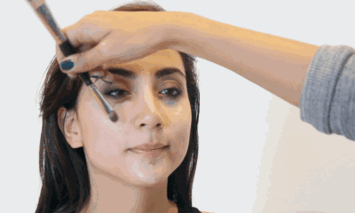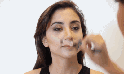 Step4:用海绵按压将高光阴影晕染自然,使妆容更服帖。
