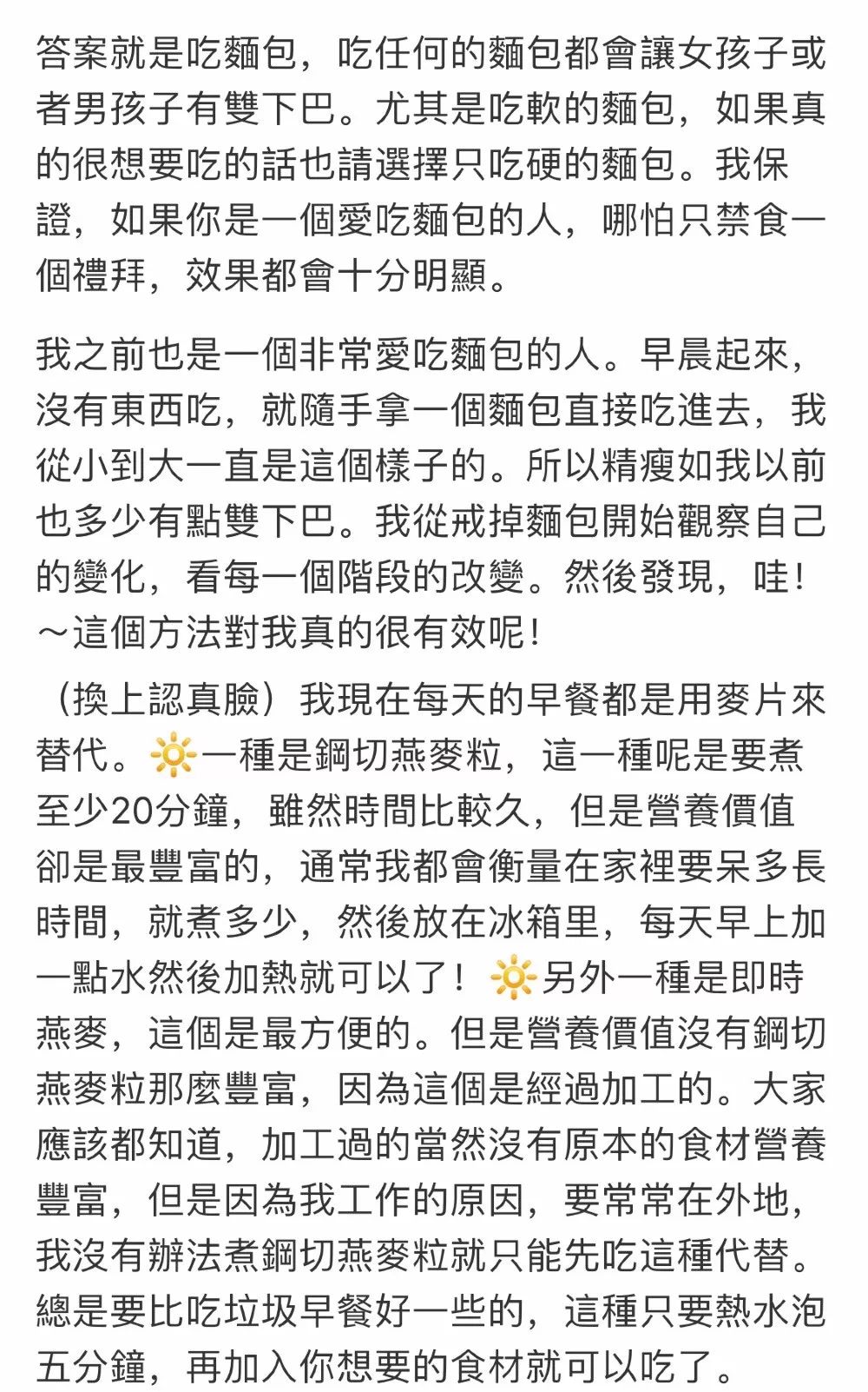 想要摆脱双下巴,管住嘴才是重点!Angela前段时间也在社交平台上Po出去除双下巴的方法:少吃面包。总得来说就是“多吃粗粮,少食精粮”,养成良好的饮食习惯!