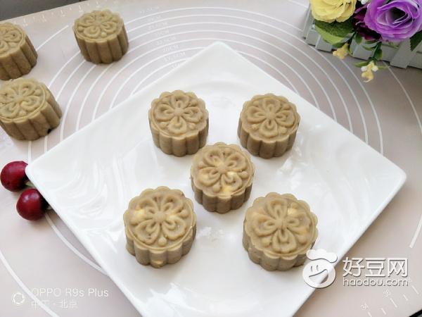 然后揉长圆,称重50克小挤,用月饼模具压下倒扣脱模放盘中即可完成了水果玉米绿豆糕制作。