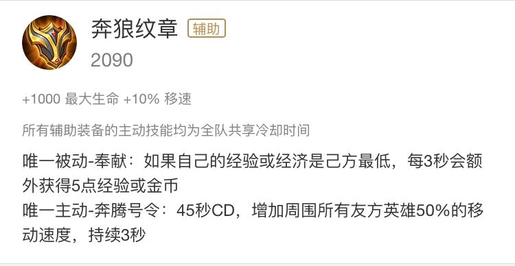 这件辅助装备是小编最喜欢出的一件装备,它不管是在前中期期的游走抓人的时候跟后期团战的时候,它的性价比可以说是辅助装备中最高的一件了。有一句古话叫天下武功,唯快不破。在王者峡谷中依旧如此,移速快可以抓人或者是逃跑,躲避非指向性型技能,因此这件能团队加速的装备的性价比不言而喻。特别是当阵容为短手阵容的时候,这件装备的加速效果是远超所有辅助装备的。