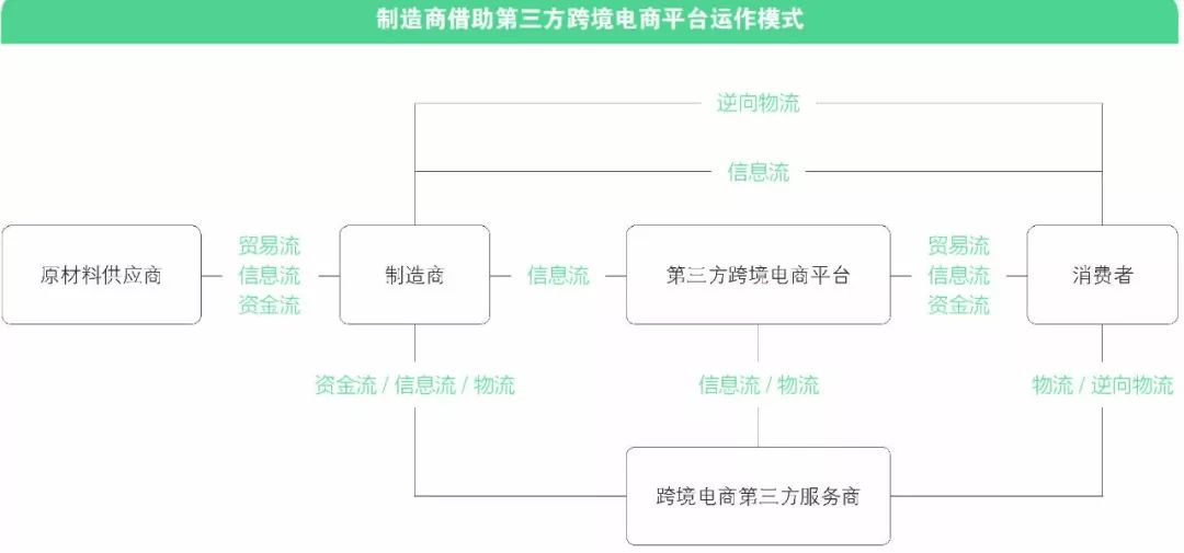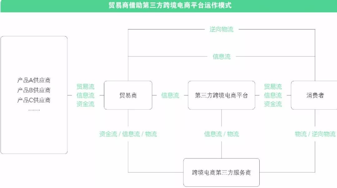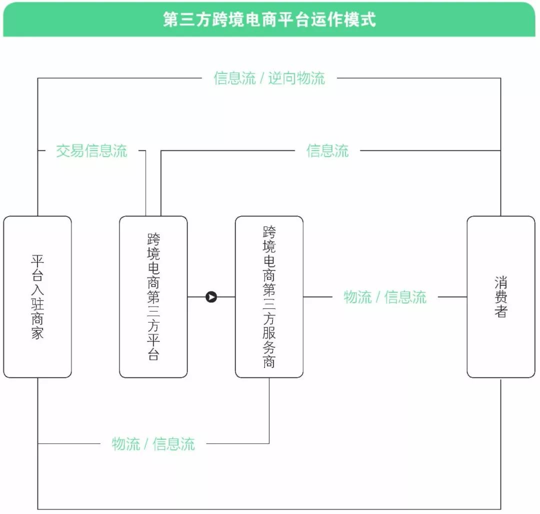 商户借助第三方跨境电商平台售卖其自身的商品,消费者通过第三方购物平台下单,支付,线上实现信息流、资金流的交易,商品实物借助跨境服务商(物流服务商)完成线下交割,消费者对商品如果不满意,还会涉及相关的逆向物流环节。这就是借助第三方跨境电商平台实现的跨境电商交易的完整环节。