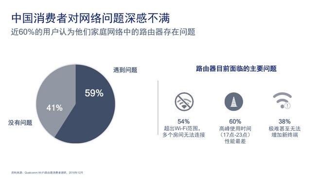 根据2016年2月Qualcomm WiFi路由器消费者调研的数据显示,中国有59%的用户认为自己家庭网络中的路由器存在问题。而在这近60%不满的用户中,有60%的人不满高峰使用时间(17时至23时)路由器性能最差,54%的用户则反映超出WiFi范围多个房间无法连接,另外还有38%不满极难甚至无法增加新的终端。