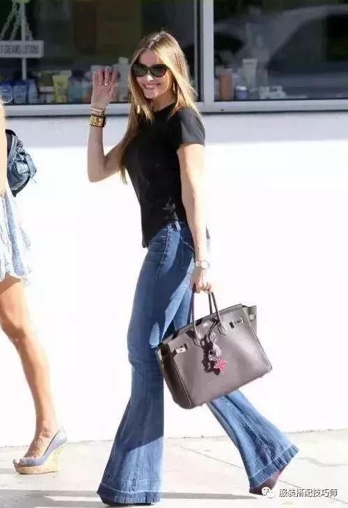 4、微喇裤+厚底鞋,轻松穿出大长腿。▼