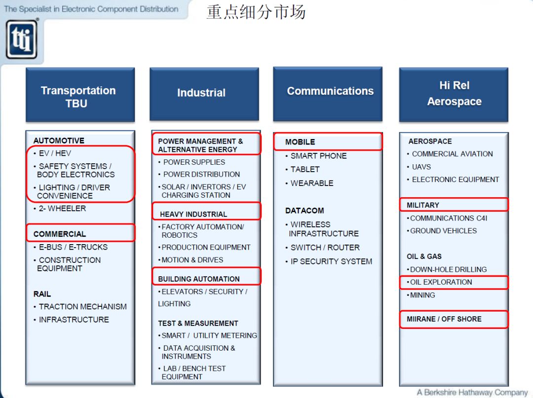 TTI, Inc. 是一家专业的被动元件, 连接器,机电组件和分立器件的授权分销商,也是一家40多年来一直敢于备货、拥有大量现货库存的分销商。TTI成立于1971年,2000年收购Mouser,2006年被Berkshire Hathaway收购。2017年TTI收购Symmetry和CHANGNAM I.N.T.公司,营收总额达到38亿美金,亚洲市场增长10%。