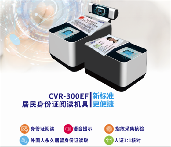 CVR-300EF台式身份证阅读机具,是由华视电子研制开发的多功能身份信息识别采集机具,可进行居民身份证信息读取、外国人居留证读取、持证人指纹信息采集、人像采集、以及1:1比对查验等多功能应用,能够满足不同的业务需求,可应用于银行、保险、通信、公安、酒店等各行行业,实现指纹验证、身份证读取的人证合一验证,真正证明身份信息中的你就是你。