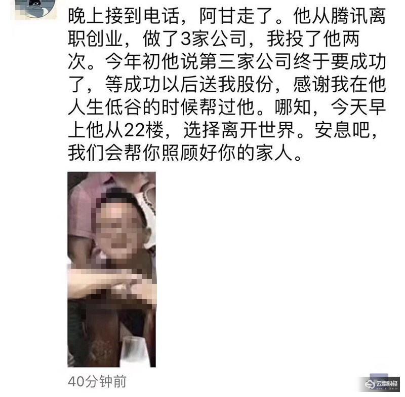 从字里行间可以知道,阿甘是众多创业者中的一员,曾连续创立过三家公司,在第三家公司尚未成功之际,他选择用跳楼的方式结束了自己的生命。发朋友圈的人疑似法兰互动投资人、Tap4Fun创始人杨祥吉,而阿甘指的是法兰互动创始人甘来。这一不幸的消息得到了多位人士的证实,其中就包括甘来在腾讯IEG部门的前同事。
