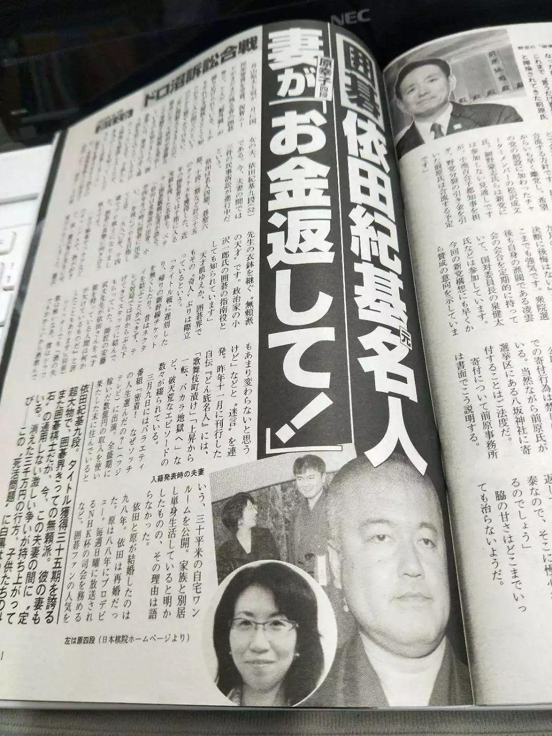《周刊文春》近日报道此事,介绍曾获得35个头衔的围棋界头号无赖派依田纪基九段,与同为职业棋手的妻子原幸子,夫妻之间“定式”不再,而是爆发激战。围绕消失的3000万日元去向、孩子们的呼声等,这个“黑与白的死活题”是否有解?