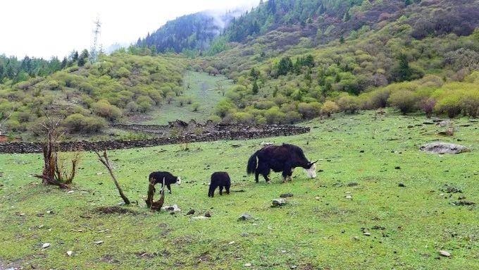 沿着人参果坪的小溪漫步,放眼坦荡妩媚的草地,这里山水相依、草木相间、云遮雾绕,透过沙棘树沿溪流回望,云雾笼罩的青山、沙棘树丛、潺潺溪水和牦牛构成了一幅和谐画卷。