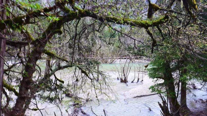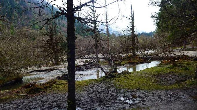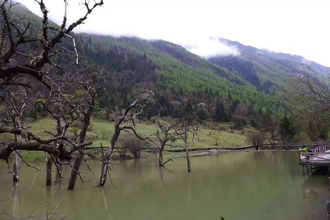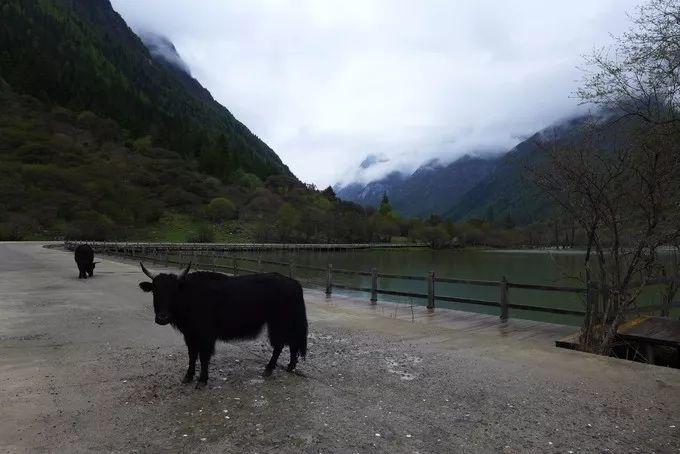 在雨中,沟里的海子、枯树、山峰、牦牛、白塔、经幡,仍构成了一幅美丽的画卷。在盆景滩,可以饱览高原湖泊的美丽、枯树的刚毅、牦牛的悠闲。