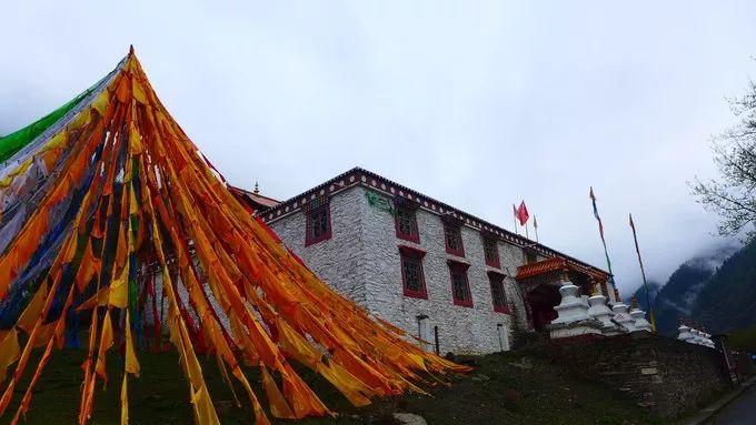 高原上的马,普遍矮小,并且藏民把马鞍垫上了厚厚的棉被,骑上去没有想象的痛苦。 一进沟,便是斯古拉寺,据说有1300年的历史了,摇曳的经幡在为我们祝福。云雾仍弥漫在山间,能否见到四姑娘呢?