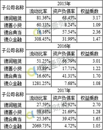 在新力金融2015年至2017年的财报统计中,非全资子公司提供了详细的财务数据,以下图表为非全资子公司(德润租赁、德善小贷、德合典当、 德众金融 )统计得出(见图8、图9)。