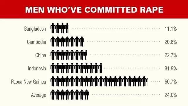 如果真的存在所谓的“强奸文化”,那我们应该明白每个国家因其对性*力暴**的纵容或惩罚程度不同,因此性*力暴**比率差异也很大。我们确实意识到了这种差异。我们也许还记得,在美国,有6%到14.9%的大学生坦白自己有过强奸举止。这个数据似乎挺吓人的,但还有比这更吓人的。发表在医学杂志《柳叶刀》上的一篇研究报告上有这样的数据⑦:在中国,将近23%的人声称自己有过强奸的举止,而在巴布亚新几内亚,这类人就占了60.7%,这个数字真是让人不忍直视。