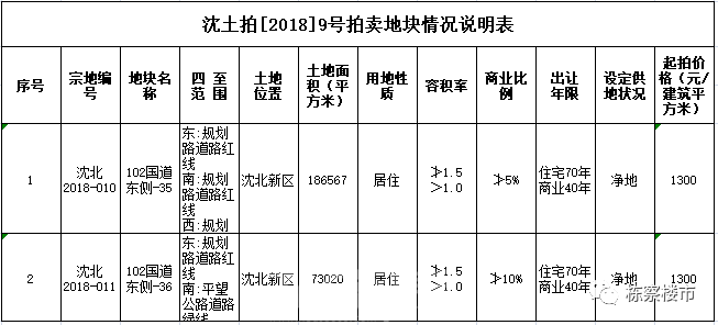 从公开资料上显示,102国道东侧-34、102国道东侧-37两宗地块位于沈北新区,占地面积分别为72651平方米、25408平方米,用地性质为商业(其它服务设施),容积率均为不大于1.0,商业比例100%,出让年限40年,起拍价格为900元每建筑平方米。